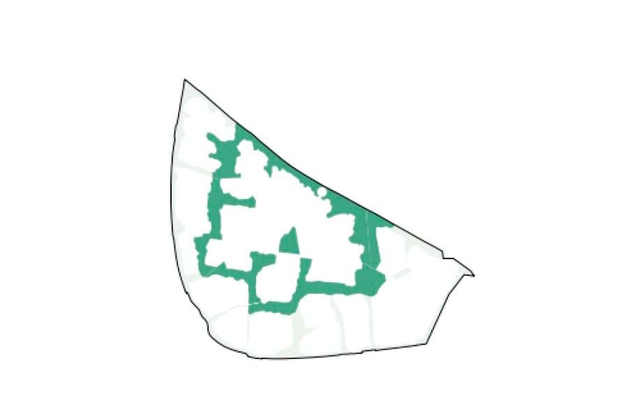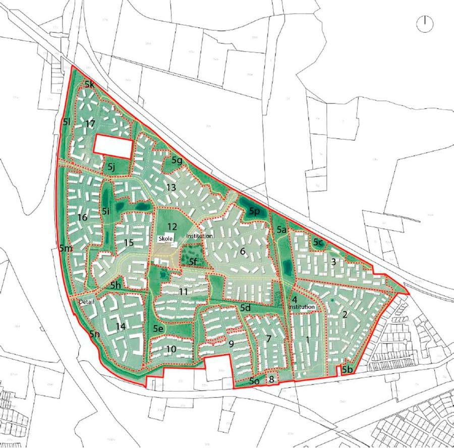 Figur 18: Eksempel på en klynge inden for et byggefelt, der opdeles i grupper af tæt-lav bebyggelse. Her er vist fem grupper.