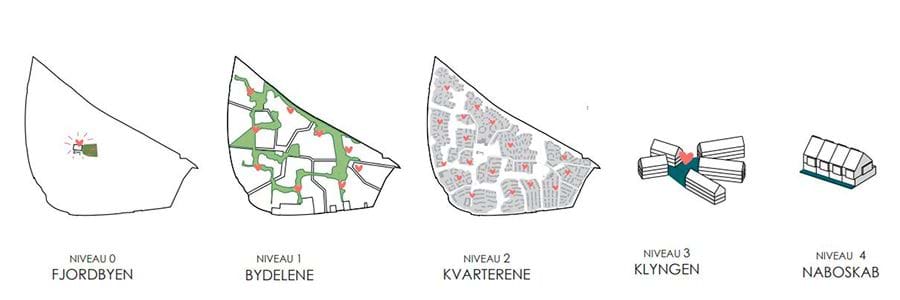 Fjordbyen placeres i forlængelse af den eksisterende by, og området opdeles i bydele, kvarterer og klynger. Der arbejdes med fællesskab i et hierarki, der spænder fra hele Fjordbyens fællesskab på det centrale torv til de helt nære fællesskaber mellem naboer.