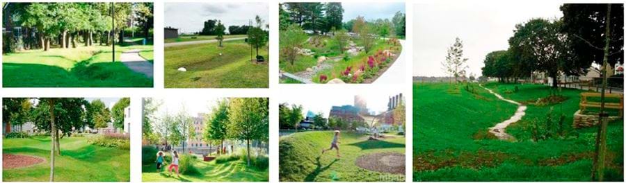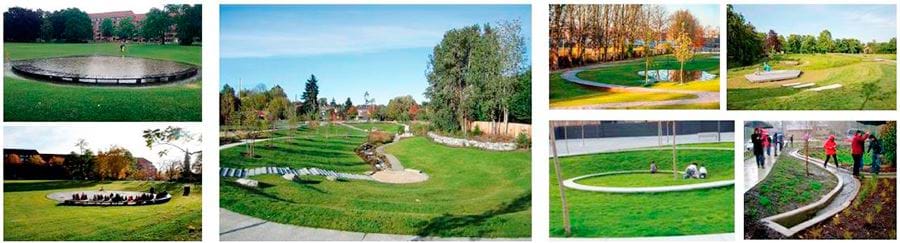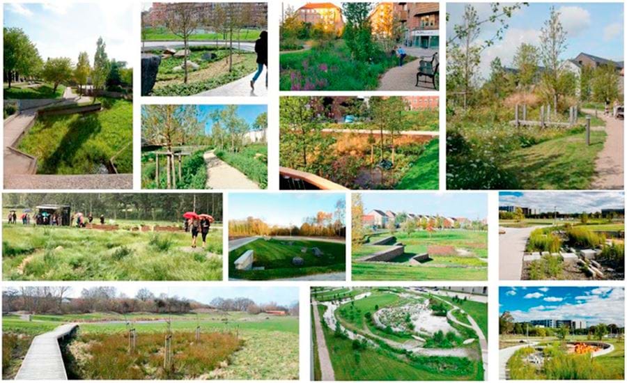 Figur 36: Eksempler på regnvandshåndtering, der indgår som en naturlig del af grønne fællesområder.