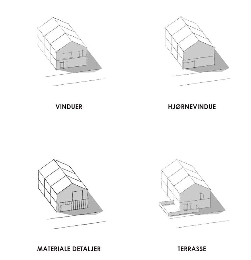 Der skal på størstedelen af tæt-lavbebyggelsens gavle være et øget fokus på detaljering eller bearbejdning. Lokalplanen sikrer, at den enkelte gavl, som fremgår af Figur 24 og Figur 25, bearbejdes med min. to af følgende detaljer: Flere vinduesåbninger, større hjørnevinduer, materialedetaljer, overdækning i form af tilbagetrækning af stueplan eller terrasser. På Figur 23 fremgår principperne for bearbejdningen af gavlene.
