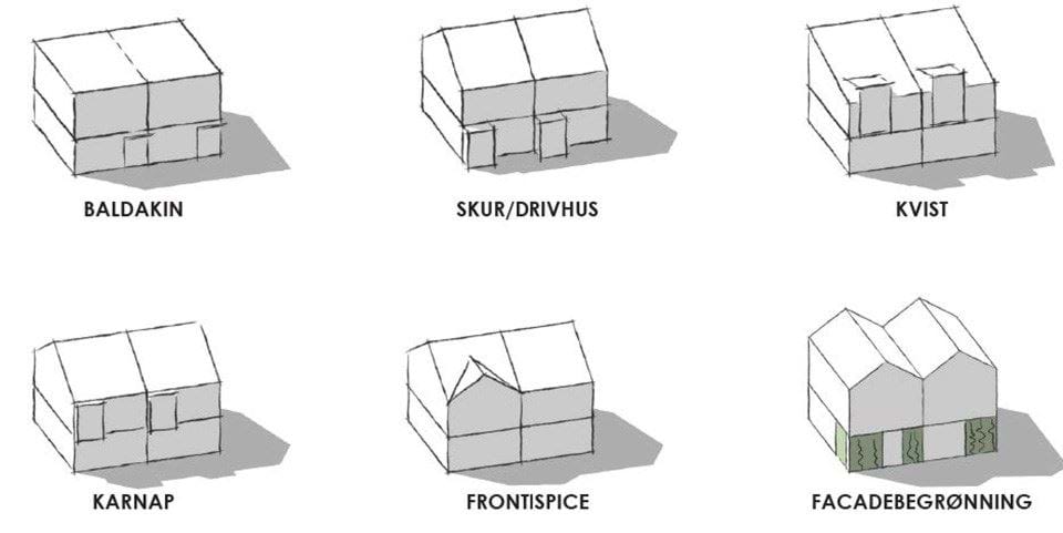For at skabe variation i tæt-lav bebyggelse sikrer lokalplanen, at der inden for hvert byggefelt anvendes mindst to af de følgende facadevariationer: Skift i materialer og farver, relief i murværk, baldakin, et påsat udhus eller kvist/karnap. Eksempler på disse principper kan ses på Figur 22 mens Figur 26 viser eksempler på de særligt bearbejdede facader.