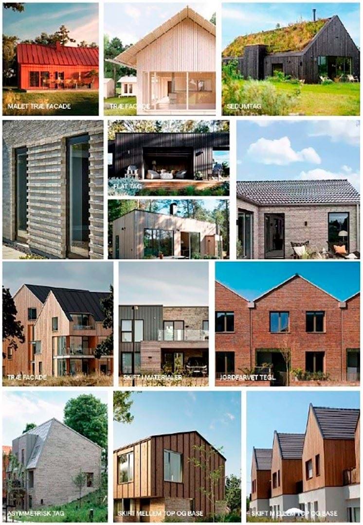 Figur 21: Eksempler på facadematerialer og -farver, tagudformning samt materialeskift der understreger top og base i delområde 2.