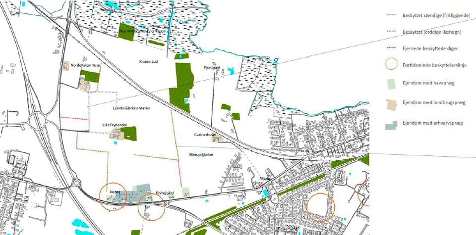 Figur 2: Oversigtskort fra landskabsanalysen, der blandt andet viser beskyttede sten- og jorddiger og fortidsmindebeskyttelseslinjer. De to fjernede diger (rød stipling) er ved lokalplanens udarbejdelse ikke længere omfattet af beskyttelse.