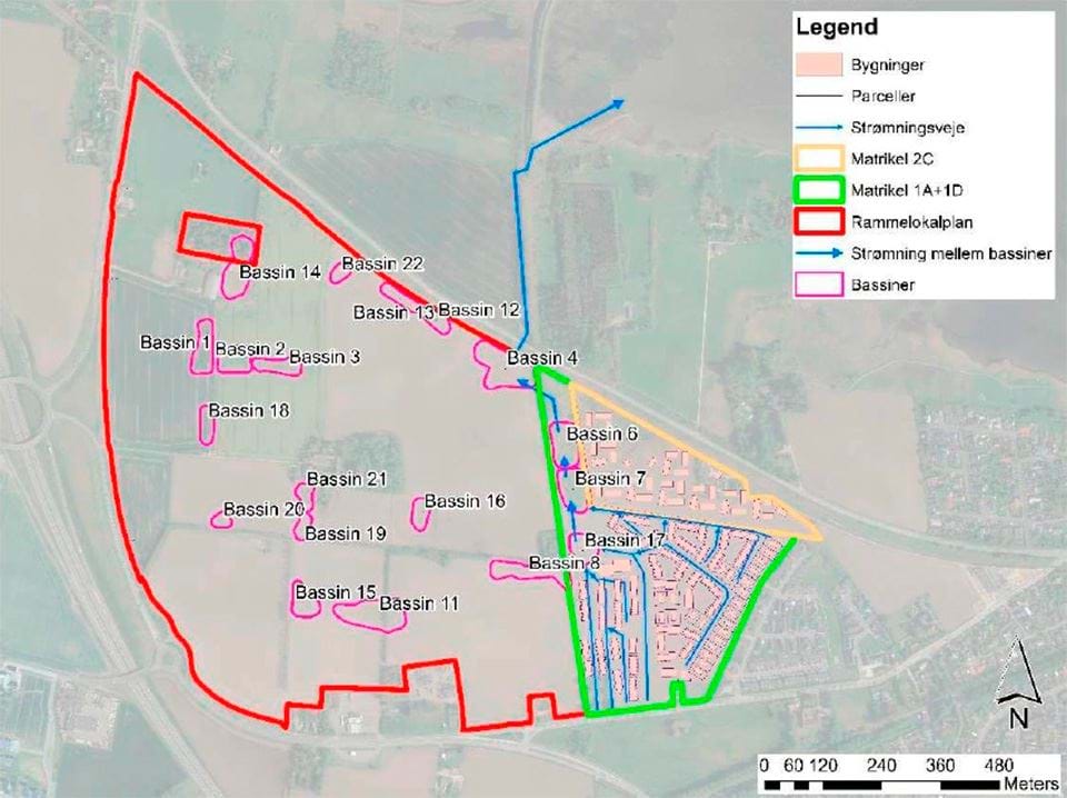 Til hvert bassin er opgjort et topografisk opland, hvorfra det vil være muligt at lede vand til hvert bassin på terræn. På Figur 76 fremgår princippet for bassinplaceringer, hvilket også fremgår af kortbilag 7.