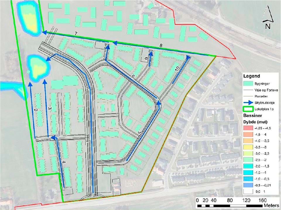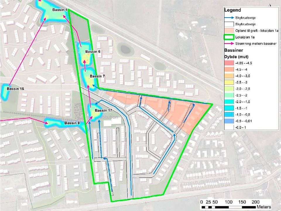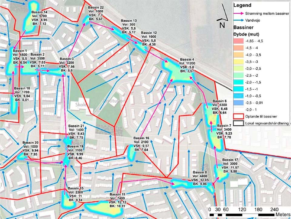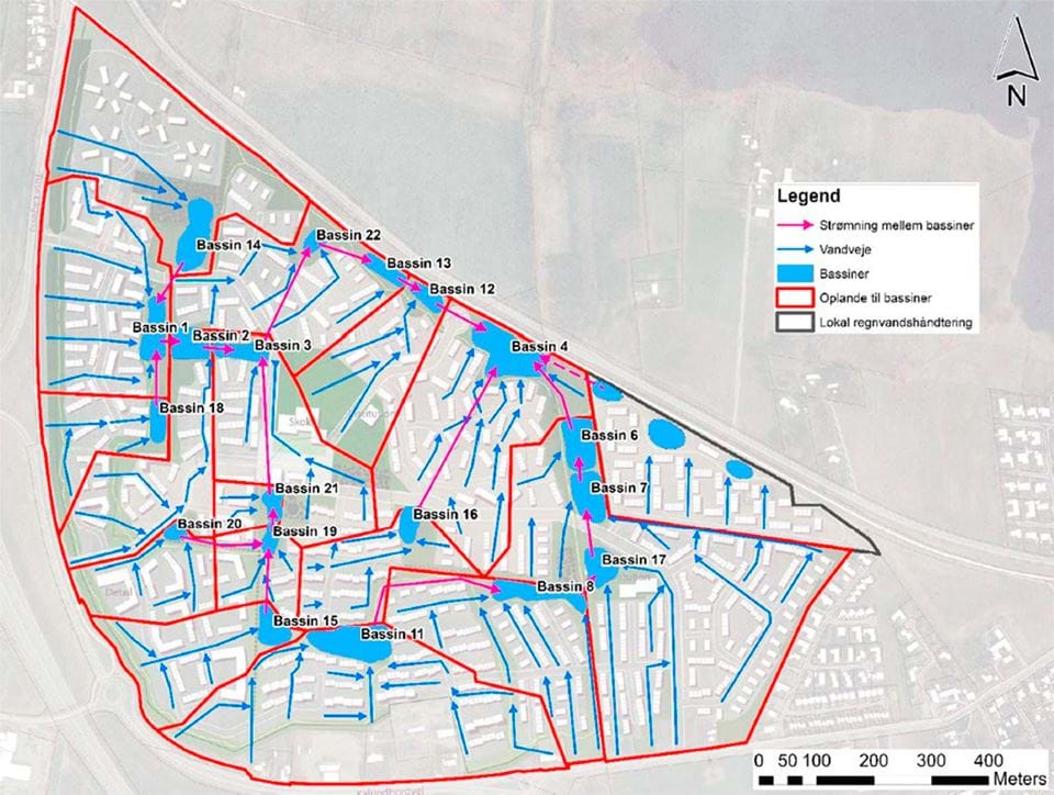 Figur 76c: Overordnet regnvandshåndtering med bassiner der viser en 100-års regnhændelse (bassiner, oplande og strømning mellem bassiner).