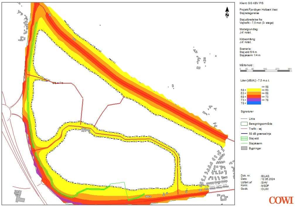 Der er således udarbejdet støjkonturkort, der for højderne 1,5, 4,5, 7,5 og 10,5 meter over terræn definerer området, hvor grænseværdien for vejtrafikstøj på Lden = 58 dB er overholdt. Indenfor disse rammer er der udarbejdet et forslag til bebyggelsesplan.