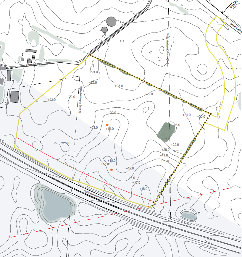 Planområdets terræn er kuperet og skrående, hvor det højeste punkt er i den nordvestlige del (kote 24) og den laveste del er i den sydøstlige del (kote 16). Den naturlige hældning i terrænet skal indtænkes i planlægningen, hvor lavningerne i området skal udnyttes i forlængelse af regnvandshåndteringen for området. Terrænets højdekurver er i varierende højde, og det vil være nødvendigt med terrænregulering på over 0.5 meter, hvis lokalplanen skal realiseres.