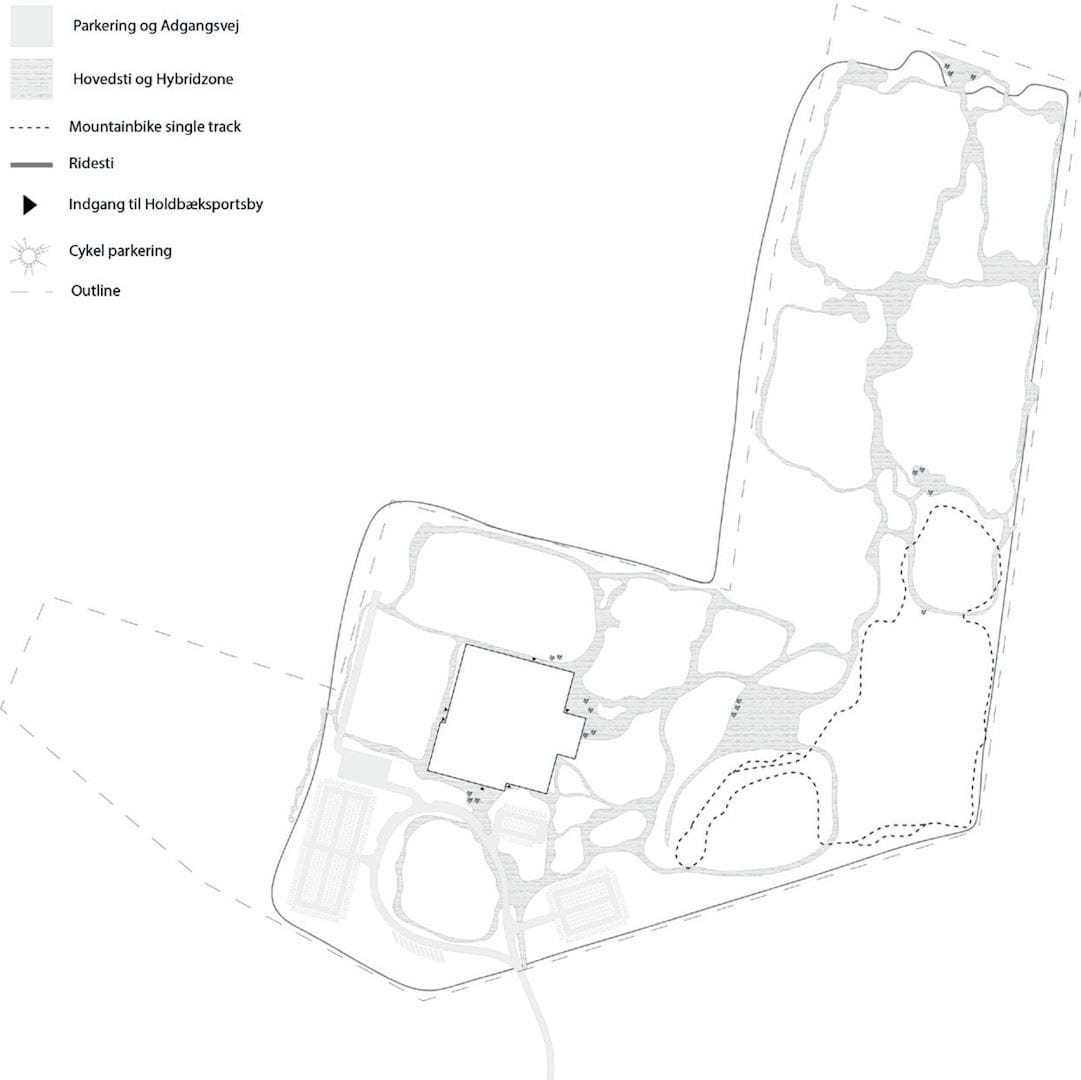 Den sorte struktur består af vej og et stinet, som er lagt ud i kontinuerlige loops. Stinettet er slynget og giver mulighed for at slentre igennem parken og opleve landskabet eller man kan tage en mere direkte forbindelse for at komme hurtig igennem parken. Det samlede loop er fleksibelt og kan udvides, ændres eller om programmeres efter behov. Der er separate hybridzoner, som kan indtages til f.eks. en skaterpark, et parkouranlæg, en sansehave eller en legeplads.