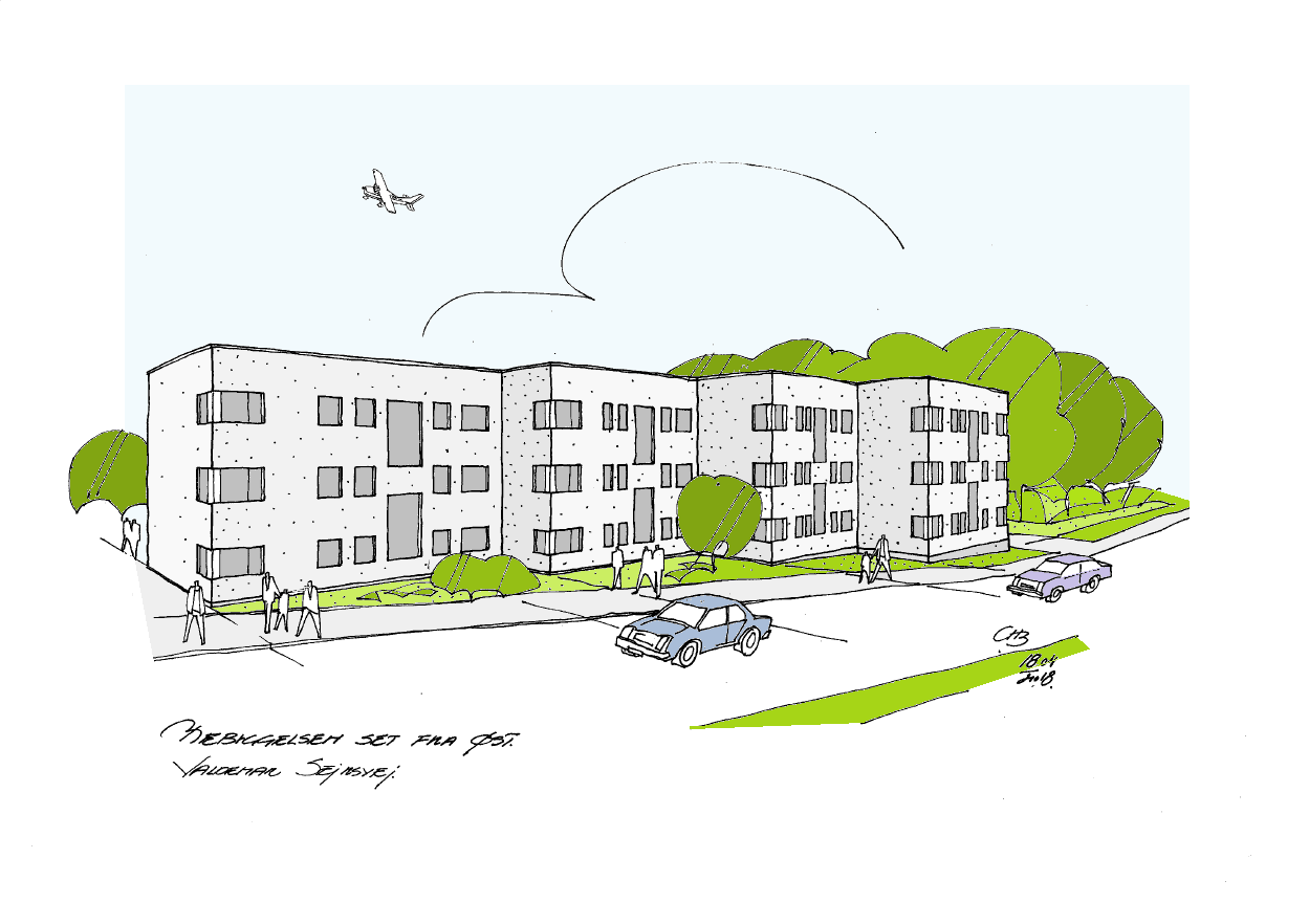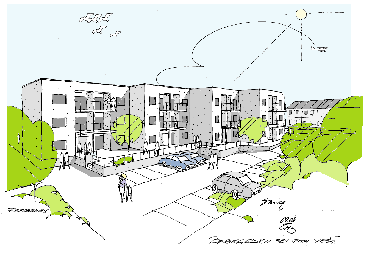 Perspektiv skitse - Bebyggelsen set fra øst, byggefelt B, bygning med 3 etager