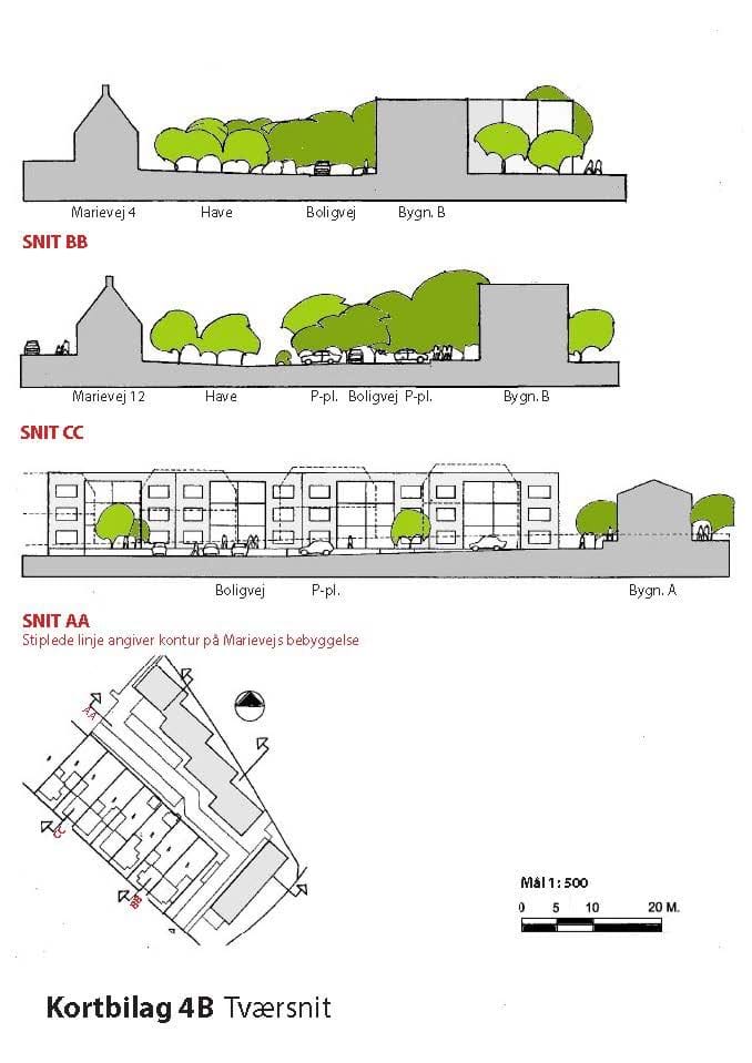 Lokalplanen indeholder et kortbilag, der viser forskellige tværsnit. Tværsnittene illustrerer, hvordan boligprojektets bygninger fremstår ift. omkringliggende bebyggelse og terrænet i området. Tværsnittene fokuserer på bygningshøjder og afstande imellem bygningerne ift. terrænet. Den stiplede linje på 'snit AA' viser konturen af Marievejs bebyggelse, hvor det fremgår, at Marievejs bebyggelse fremstår en smule højere end etagebebyggelsen. På baggrund af tværsnittet vurderes det, at boligprojektet ikke fremstår så markant højere end Marievejs bebyggelse, afstand og terræn taget i betragtning.