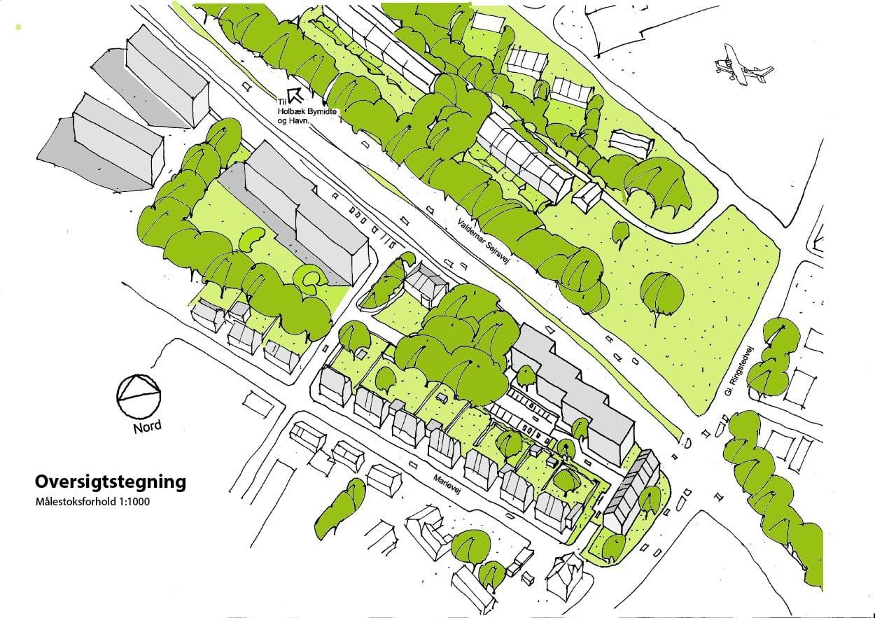 Oversigtstegning af lokalplanområdets bebyggelse og de omgivende forhold