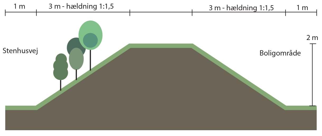Støjvolden skal minimum være 2 m høj og anlægges med en hældning på 1:1,5, med en rabat på 1 m, på hver side. Volden skal tilsås med græs.
