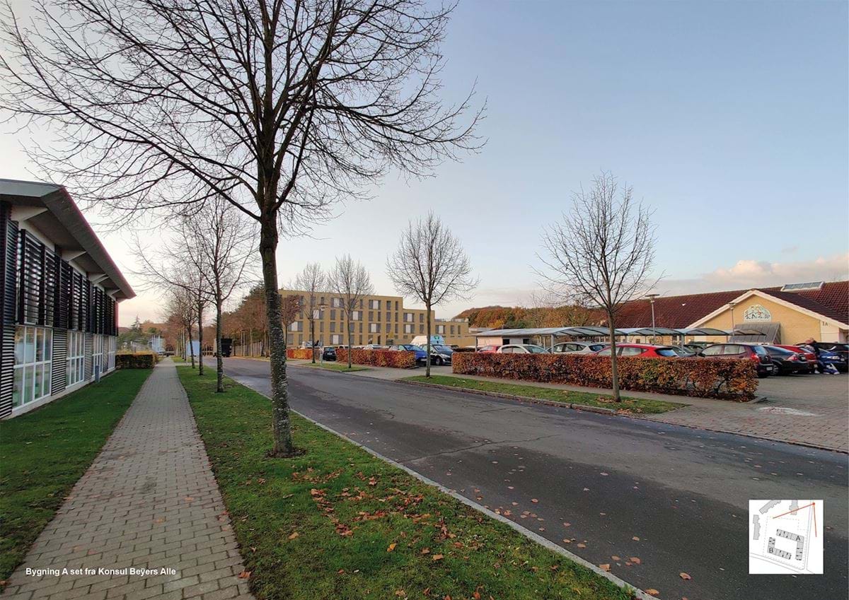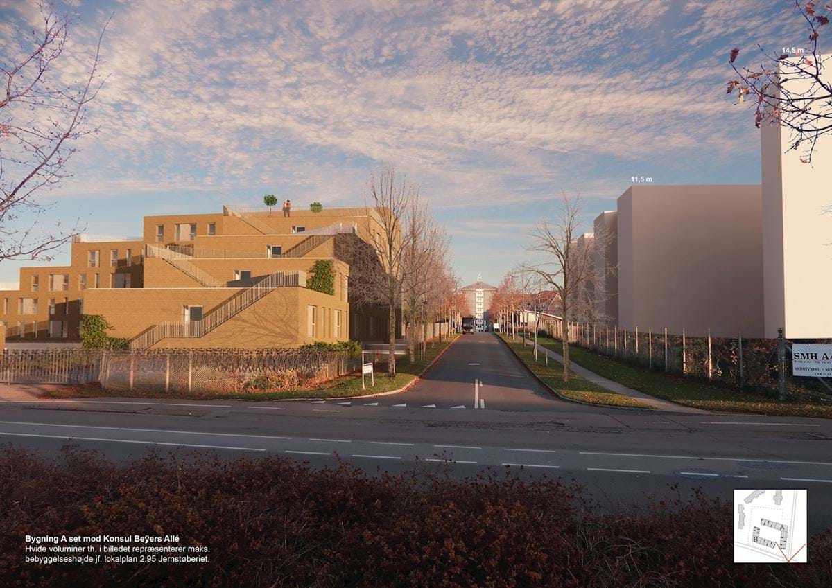Illustration 12: Visualisering af bebyggelsen set fra Konsul Beÿers Allé mod Lundemarksvej.