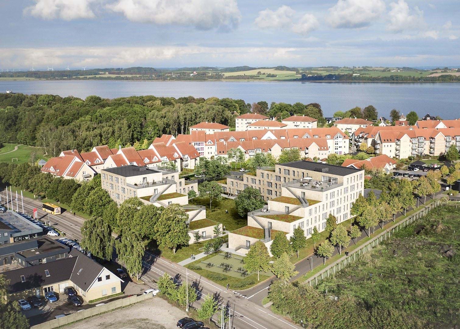 Illustration 10: Visualisering af bebyggelsen set fra Lundemarksvej mod Konsul Beÿers Allé med de endnu ikke opførte rækkehuse tegnet ind som volumener.