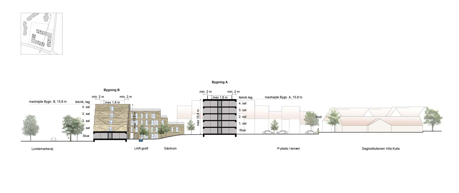 Det skitserede projekt medfører punktvise skalaspring til naboejendommen mod vest "Lundemarken" fra 2,5 til 5 etager og mod øst "Jernstøberigrunden" fra mulige 3 til 5 etager.