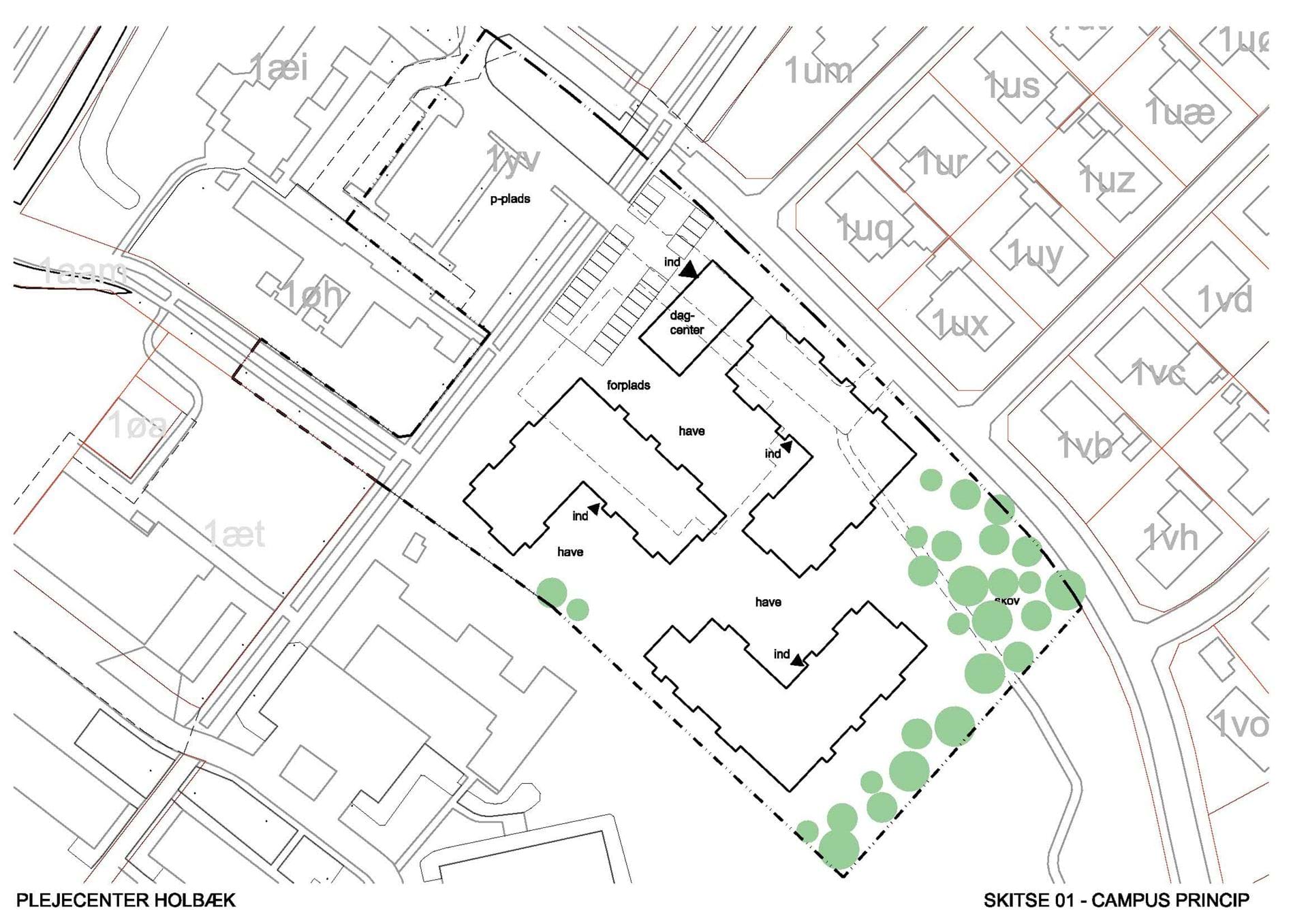 Plejeboligerne vil blive udformet som etageboliger fordelt på ca. tre fritliggende volumener i to etager. Dagcenteret vil også blive opført som fritliggende bygning, opført i én etage.