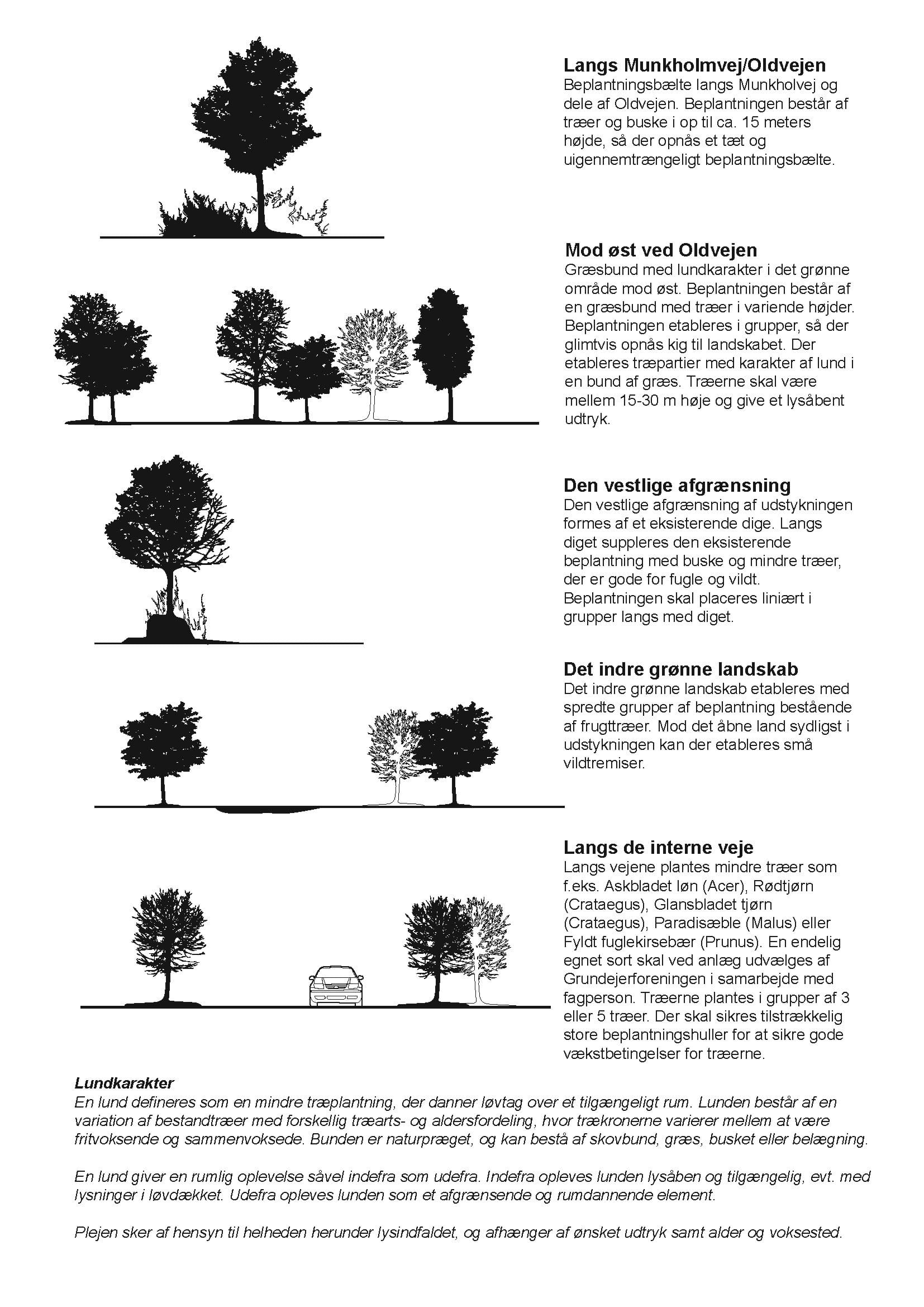 Beplantningen mod Munkholmvej og Oldvejen skal bestå af grupper af træer og buske, hvor der er en bevokset bund. Beplantningen skal være tæt og uigennemtrængelig, men med mulighed for enkelte kig til området, især ved det indre grønne landskabsrum. Beplantningen mod Oldvejen skal være med til at bebyggelsen på afstand ikke vil opleves så synlig i landskabet.