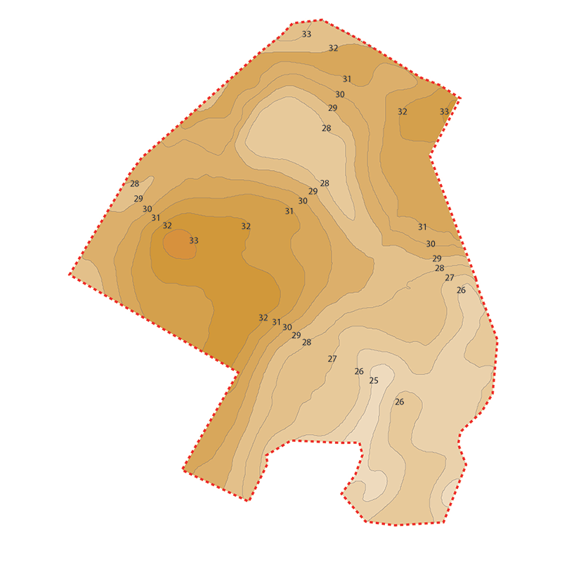 Lokalplanområdet ligger naturskønt på kanten mellem by og land, med udsigt over landbrugsarealer mod sydøst. Lokalplanområdet er kuperet. Mod nord er terrænet oppe i kote 33, hvorfra det falder mod syd og sydøst. I lokalplanområdets sydvestlige hjørne er en bakketop i kote 33.