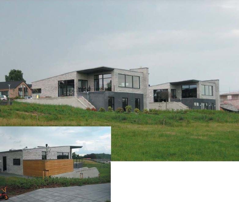 Eksempler på bebyggelse med forskudte etager, der arkitektonisk udnytter terrænets naturlige fald. Fra den ene side fremgår huset i et plan, men i 2 etager fra den anden side. Terrænspringene udnyttes desuden til at trække lys ind i husene og placere hævede terrasser og lignende.