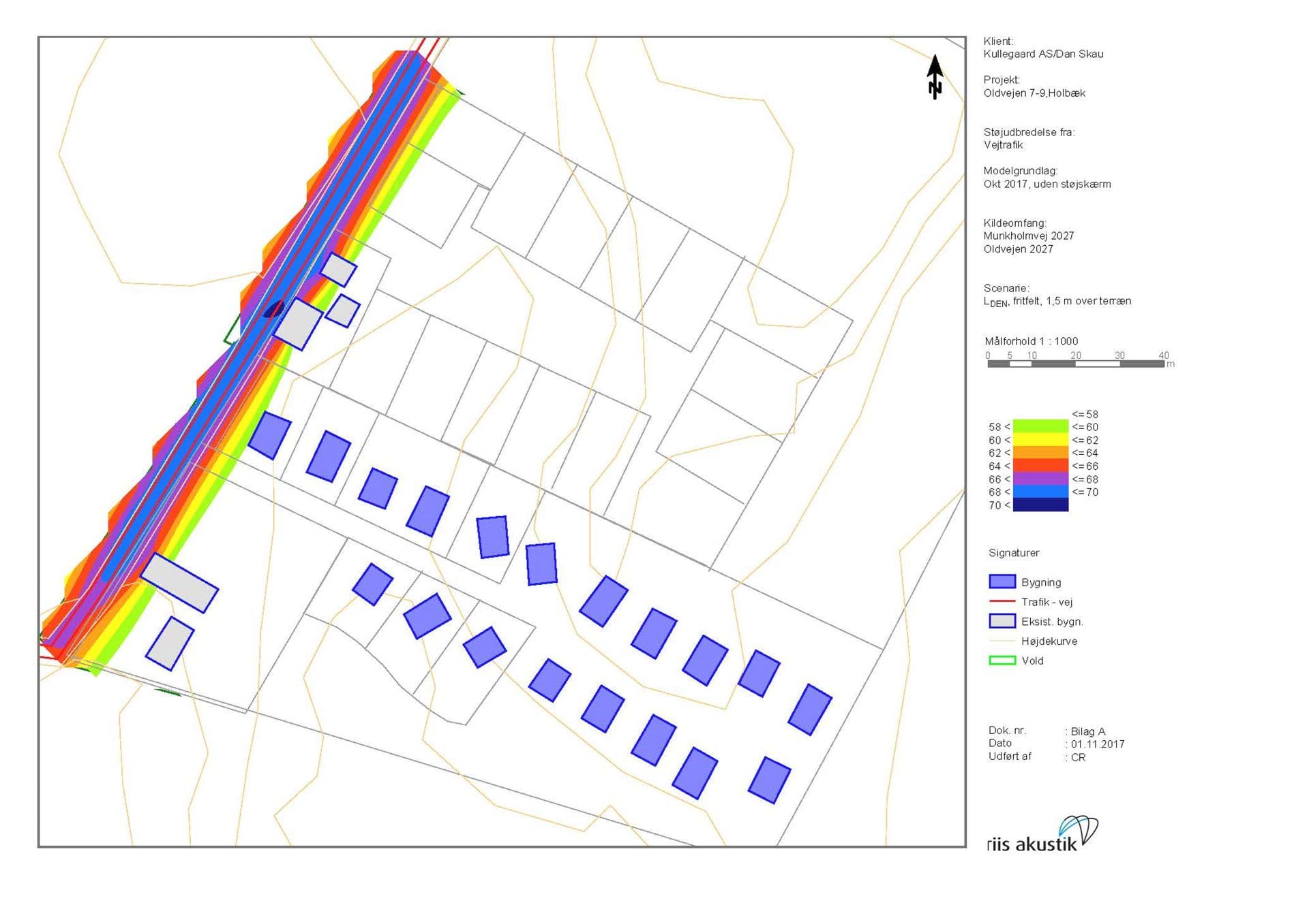 Beregningerne viser at støjkravene kan overholdes på langt størstedelen af lokalplanområdet. Pånær et kort stykke af grundene tættest mod Oldvejen. Støjnotatet konkluderer, at de yderstliggende parceller kan beskyttes tilstrækkeligt mod støj ved opsætning af en 1,8m høj støjskærm. Se også lokalplanens kortbilag 7.