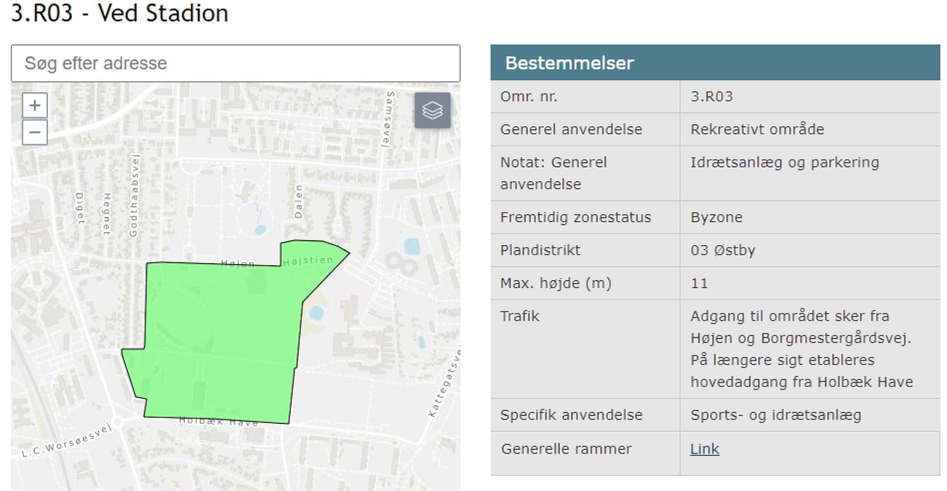 Ejendommen er omfattet af gældende Kommuneplanramme 3.R03, der udlægger anvendelsen til rekreative formål, herunder idrætsanlæg m.m., samt et mindre delareal af ramme 3.B17, der udlægger anvendelsen til boligbebyggelse.