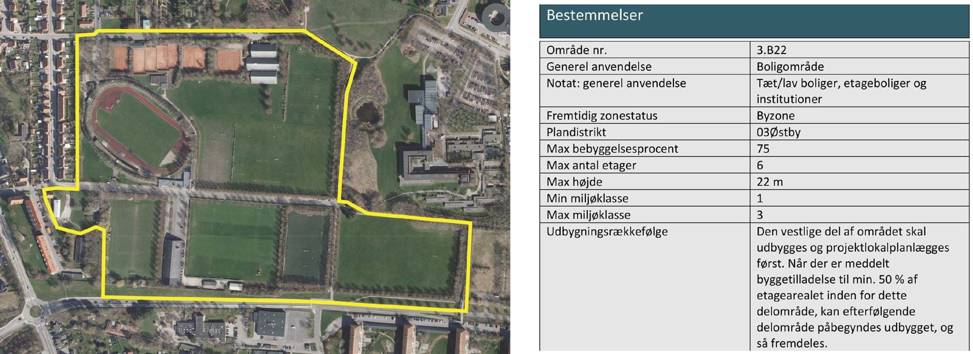 Mod vest grænser området op til et eksisterende bevaringsværdigt villakvarter, med en række fine bygninger opført som byggeri i ”Bedre Byggeskik”. Området udbygges som et nyt boligområde i en nutidig arkitektur, men byggeriet tilstræbes at hente inspiration i den tilstødende bebyggelse, dels ved materialevalg, farvesætning og ved tilpasning af bebyggelsens skala, således at der langs eksisterende villahaver maksimalt planlægges for nyt byggeri i to etager. Endvidere er bebyggelsen disponeret, så de karakteristiske stramme gadeforløb overføres til den nye bebyggelse.