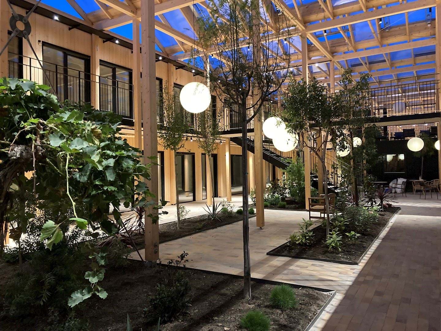 Vejledende visualisering af atriumgårdhave i den lavere boligkarrébebyggelse i to etager.