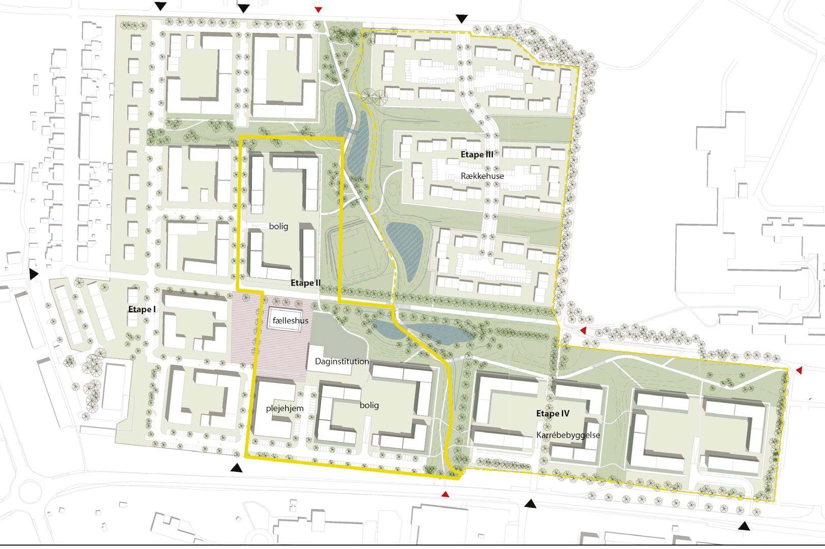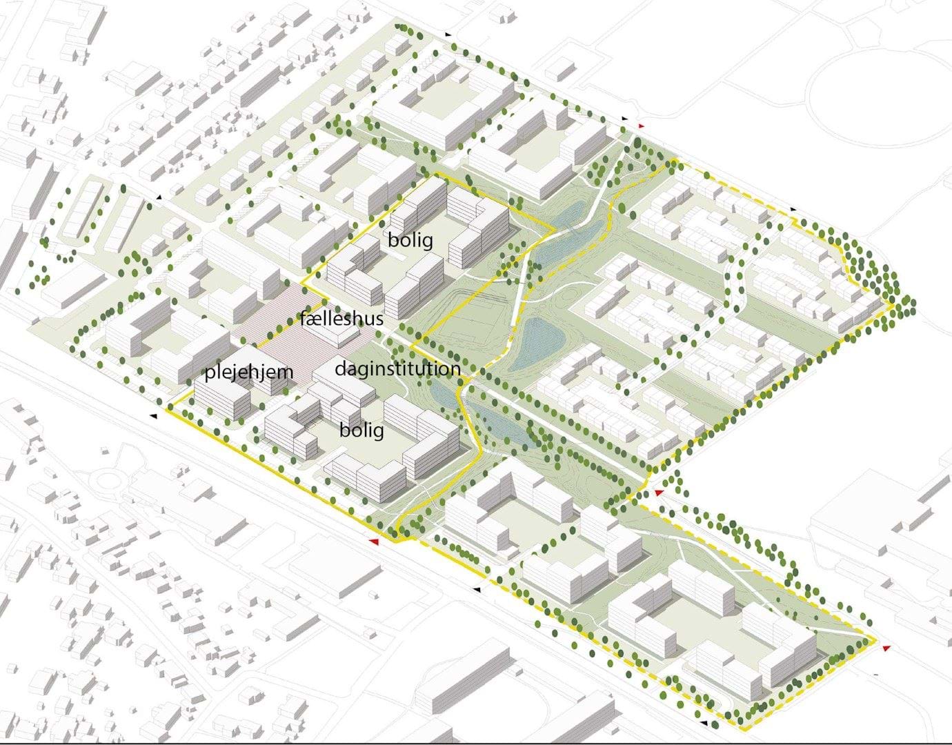 Langs kanterne af området tilpasses bebyggelsen de eksisterende strukturer, så lavere rækkehusbebyggelse møder den eksisterende bebyggelseskant mod vest, og mod nordøst, mens karrébebyggelse kanter området ud mod vejen Holbæk Have, og tegner bebyggelsen indadtil mod den grønne kile. Der etableres et byrum centralt i området, hvor der placeres et nyt fælleshus, med mulighed for at skabe fælles aktiviteter. Derudover gives mulighed for opførelse af et plejehjem og en daginstitution, der ligger ud til den grønne kile.