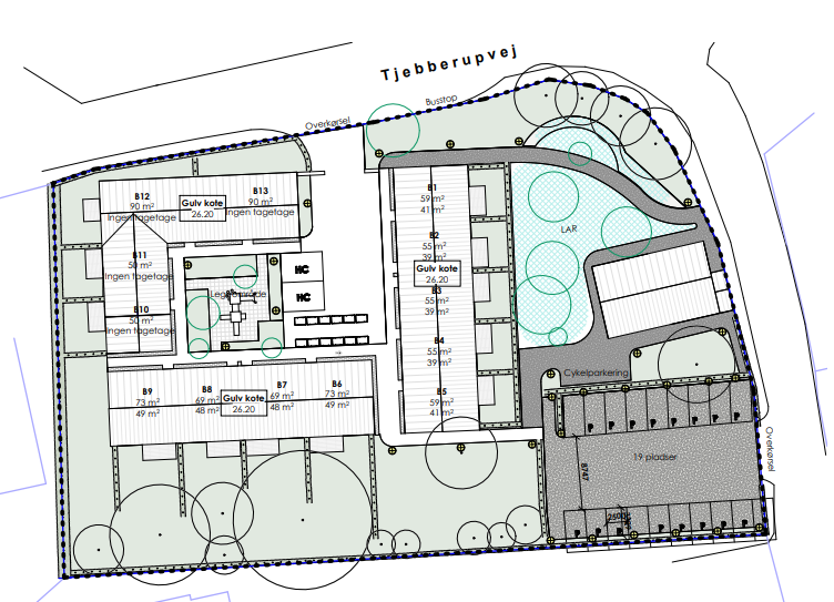 Den eksisterende bolig, der tidligere har været smedens bolig og er SAVE - registreret med en middel bevaringsværdi på 4 forudsættes nedrevet. Bygningen fremstår med én pæn facade, mens de øvrige facader har senere modificeringer som ikke er i overensstemmelse med bygningens udtryk ud mod Tjebberupvej. Bygningen fremstår med en lav loftshøjde, som gør den svært at indrette til boliger. Administrationen indstiller derfor, at lokalplanen giver mulighed for at nedrive smedjeboligen for at give plads til de i alt 20 parkeringspladser, som der stilles krav om til de 13 nye boliger.