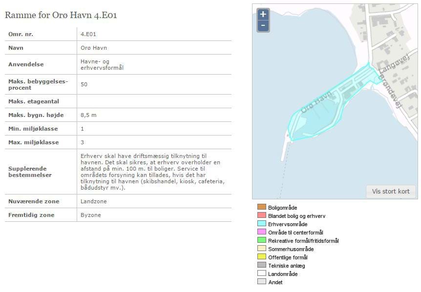 Det fremgår af de tidligere gældende kommuneplanrammer, at de fremtidige zoneforhold skal være byzone (4.E01) og by- og landzone (4.B05). Det er vurderet hensigtsmæssigt, at lokalplanområdet forbliver i landzone med den begrundelse, at Orø Havn ikke har direkte tilknytning til andre områder i byzone. Kommuneplantillæg nr. 12 til Kommuneplan 2013-25 fastholder derfor fremtidige planlagte arealer i henholdsvis landzone (4.E01) og by- og landzone (4.B05).