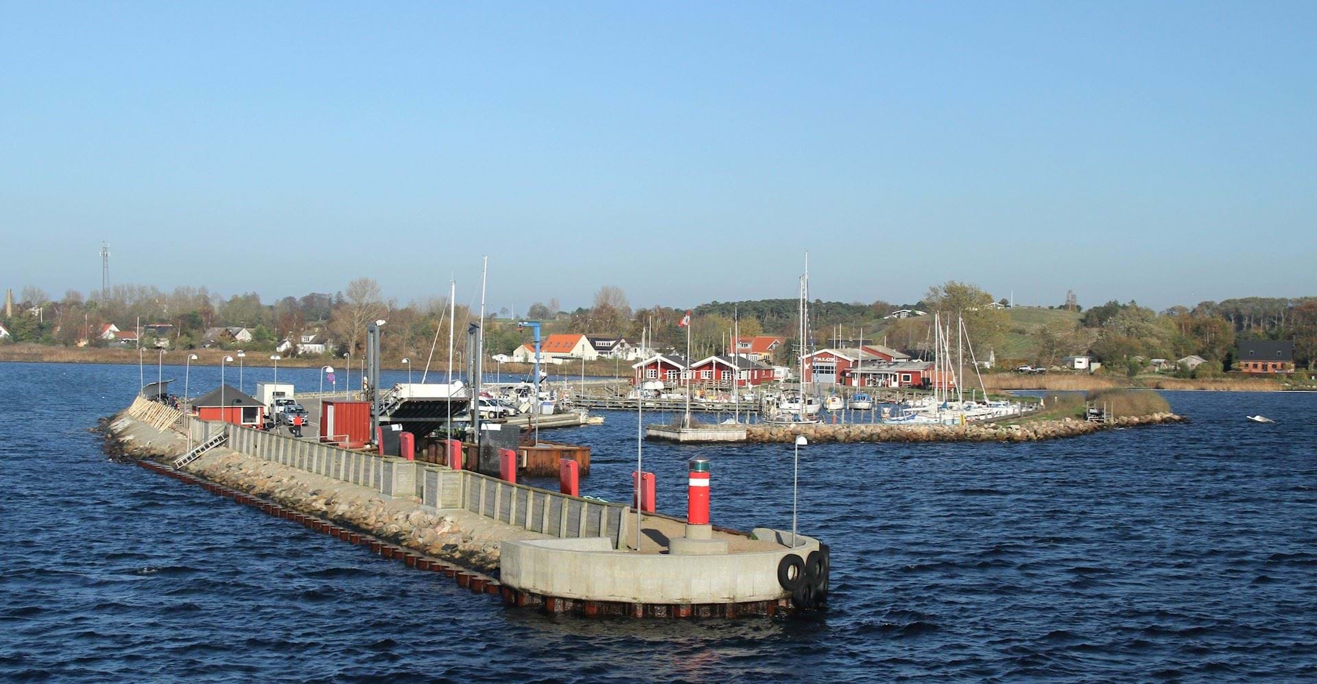 Orø Havn set fra vandsiden (oktober 2014). Den muliggjorte bebyggelse vil tilpasse sig det eksisterende havnemiljø.