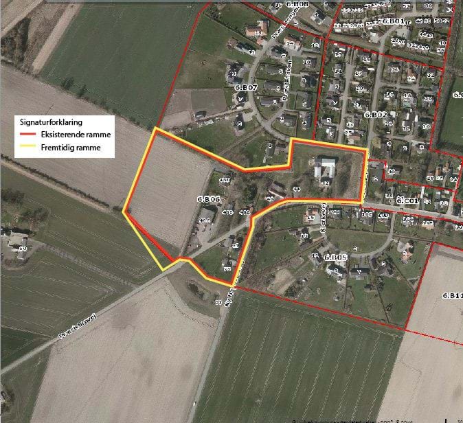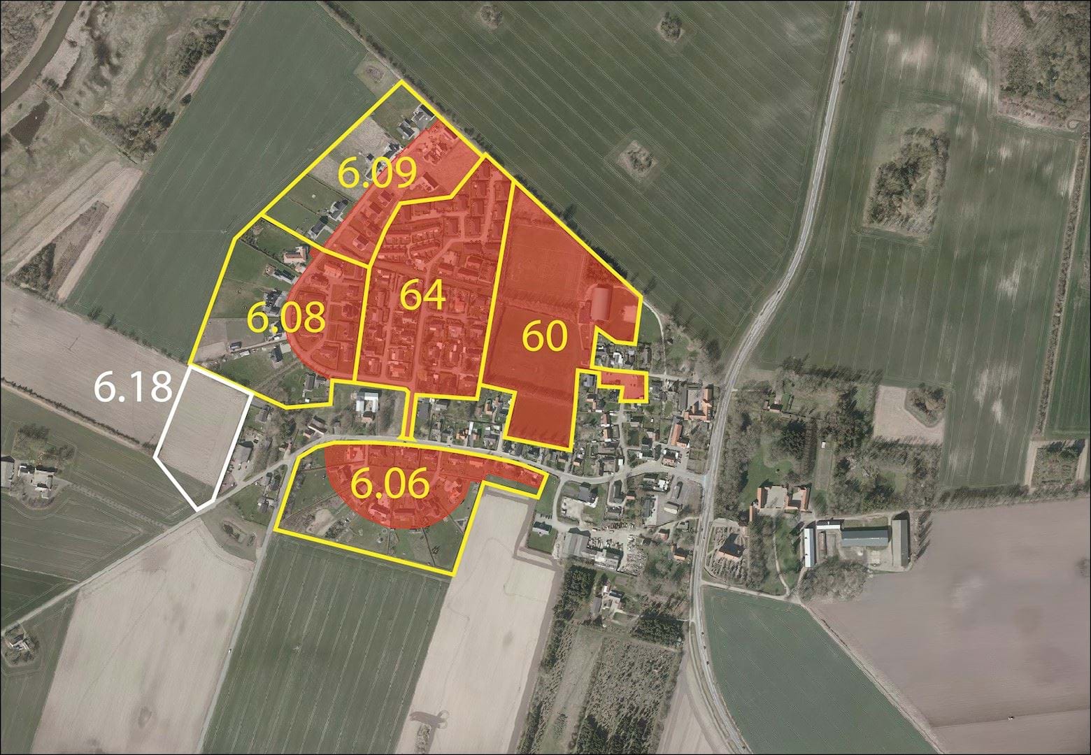 På billedet ses de eksisterende lokalplaner i Gl. Hagested (gul streg), arealer der i dag er byzone (rød) og lokalplanforslag 6.18 som vil forblive i landzone.