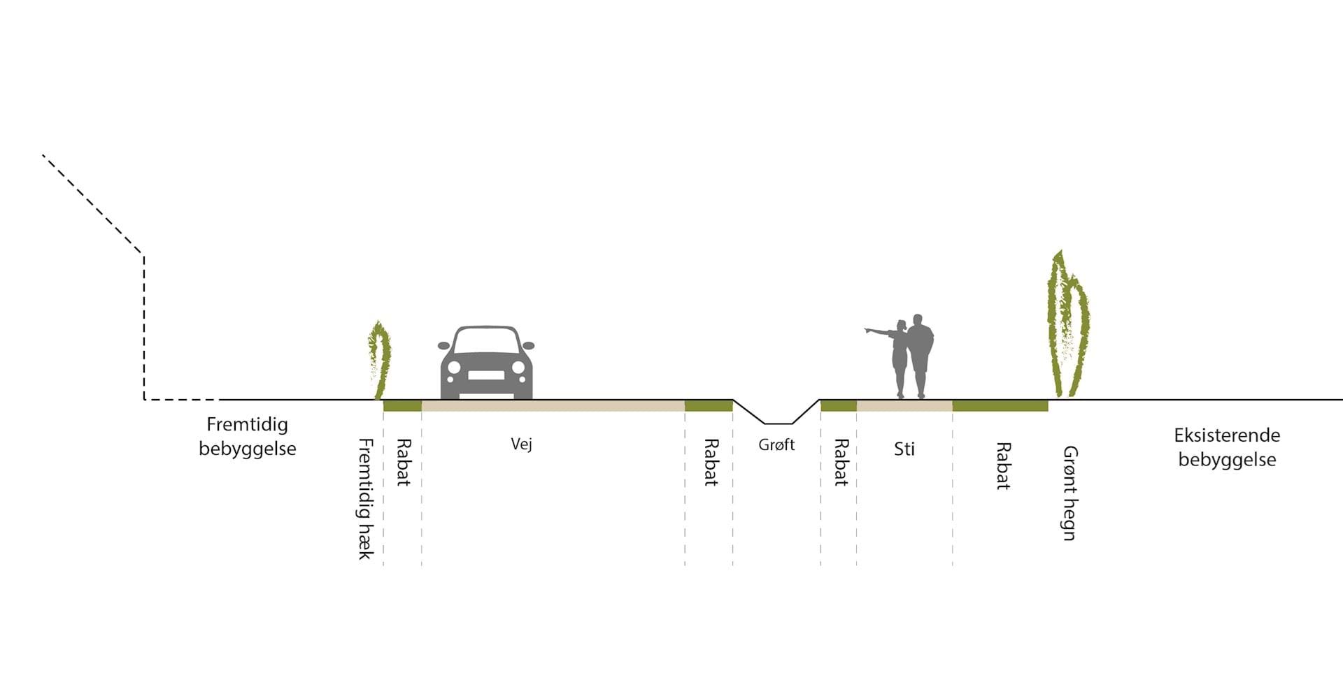 Området vejforsynes fra Præstebrovej. Den eksisterende grusvej er registreret som en offentlig sti. Der etableres en ny grusvej til forsyning af storparcellerne og den eksisterende bolig på Præstebrovej 48D. Sti og vej adskilles af en grøn grøft, så der er tydelig opdeling mellem gående og kørende trafikanter.