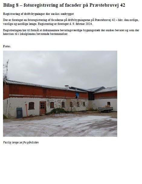 Der er foretaget en fotoregistrering af facaderne på driftsbygningerne på Præstebrovej 42 – hhv. den østlige, vestlige og nordlige længe. Registrering er foretaget d. 9. februar 2024.