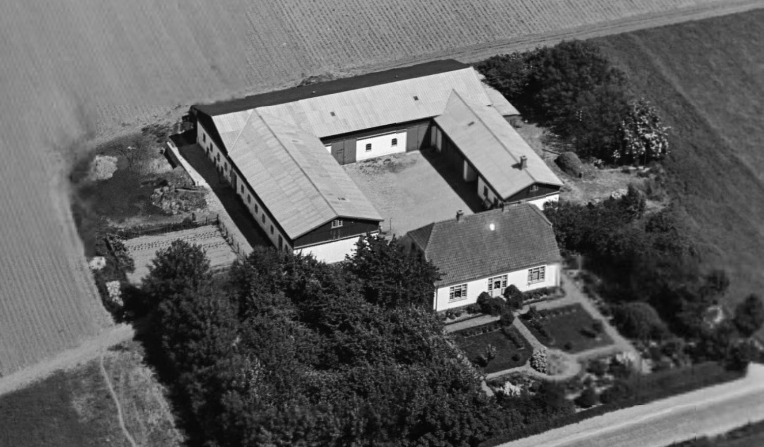 Historisk skråfoto af ejendommen Præstebrovej 42 før den var omgivet af ny boligbebyggelse og hvor den firlængede struktur fremstår helt symmetrisk.