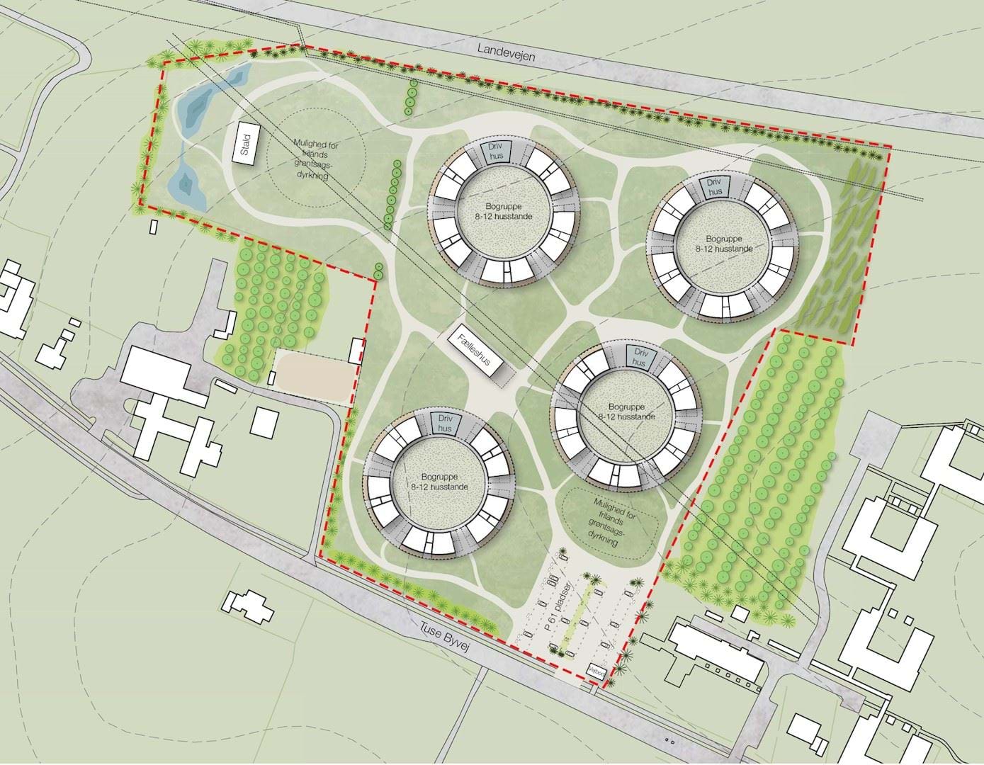 Illustrationsplan: Boliger samlet i cirkelformede bo-grupper. (Se nærmere på kortbilag 2.)