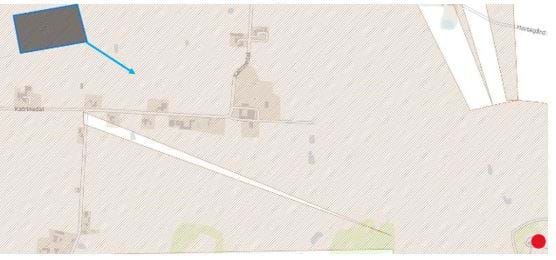 Planområdet (grå firkant) er illustreret ovenfor i det nordvestligste hjørne med kirkens placering i det sydøstligste hjørne (rød prik). Fotopunkt (blå pil) nedenfor illustrerer blikket til kirken.