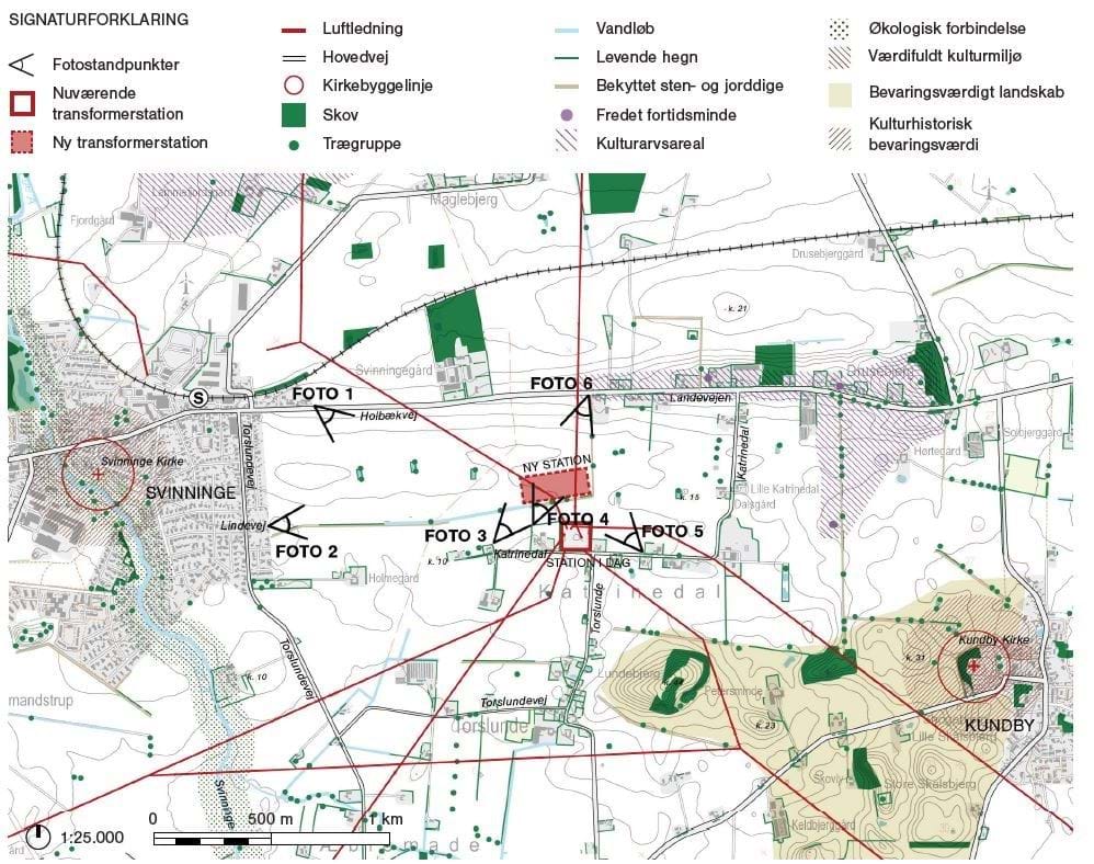 I denne redegørelse følger visualiseringer af hvordan landskabet ser ud før og efter etablering af højspændingsstation ved Torslunde. Lokalplanområdet hvorpå højspændingsstation vil ligge, er markeret med et sort rektangel på alle visualiseringerne. Nedenfor ses kort over fotostandpunkterne, hvor fotos til visualiseringerne er taget fra.