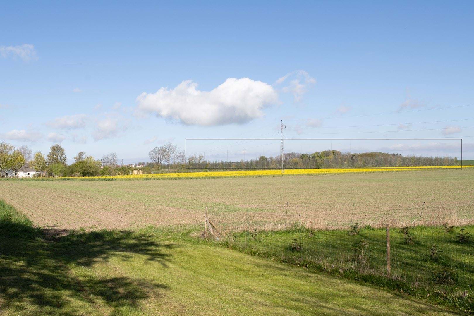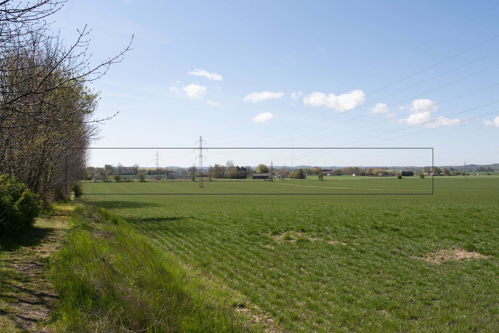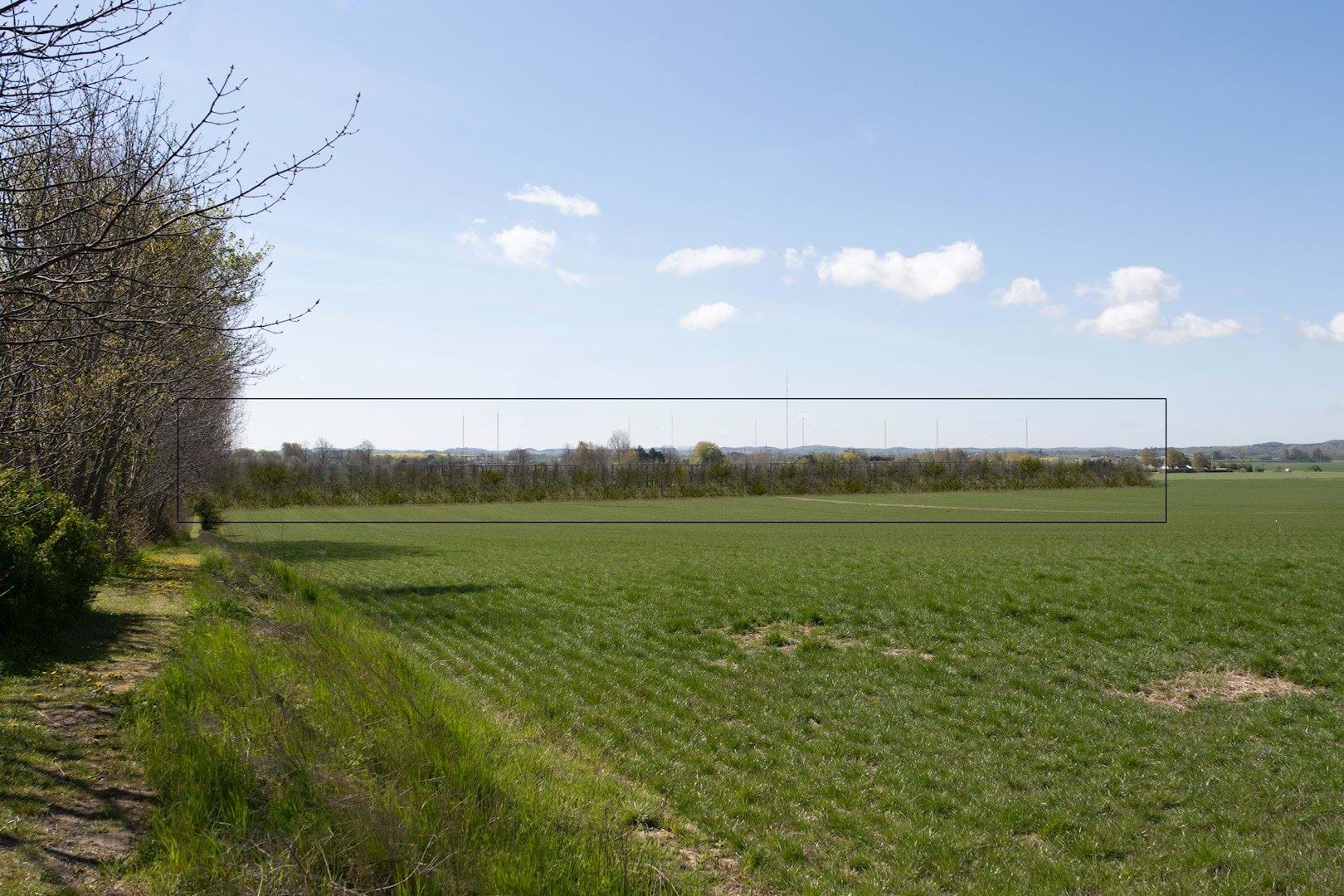 Foto 5 – I dag Set mod nordvest fra vejkant og skel ved Katrinedal 6. Til venstre i billedet ses den eksisterende transformerstation med højspændingsmaster og luftledninger. Til højre herfor ses området for placering af den nye højspændingsstation.
