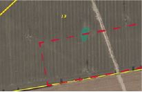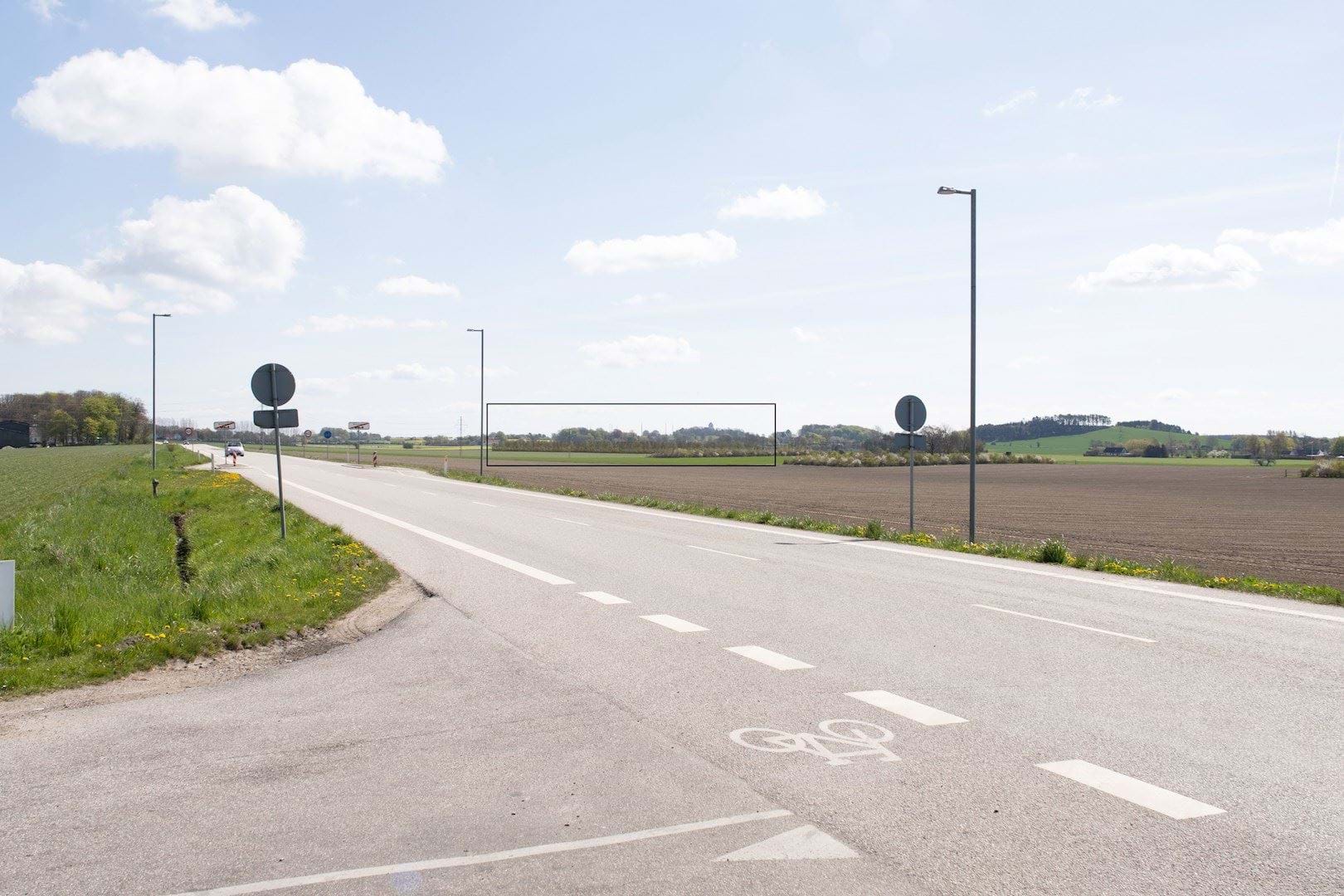 Foto 6 – I dag Set mod sydsydvest fra vejkant og skel på Landevejen 2. Til venstre i billedet ses trampestien til Katrinedal langs med læhegn og jorddige.