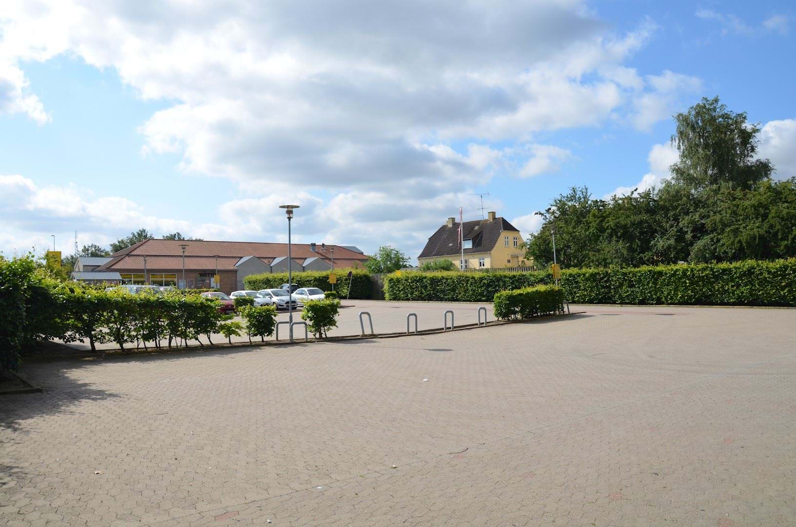 Nuværende situation i planområdet: Dagligvarebutik og parkeringsplads
