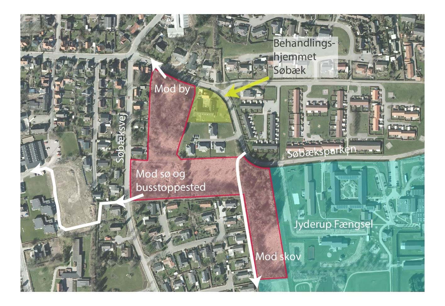 Lokalplanområdet er ca. 3 Ha, og er beliggende i gåafstand til Jyderup centrum med butikker og station. Mod øst grænser området op til Jyderup Fængsel, som er et åbent fængsel med flere aktiviteter og værksteder for brugerne. Mod syd afgrænses området af en kommunal sti mod Jyderup skov, samt et parcelhuskvarter. Mod vest afgrænses området af Søbæksvej, samt et parcelhuskvarter. Mod nord afgrænses området af vejen Søbæksparken, samt et parcel- og rækkehusområde. Mod nordøst, grænser området op til behandlingscentret Søbæk. I lokalplanområdet østlige del, gennemskæres området af en forbindene sti mellem Jyderup by og Jyderup Skov.