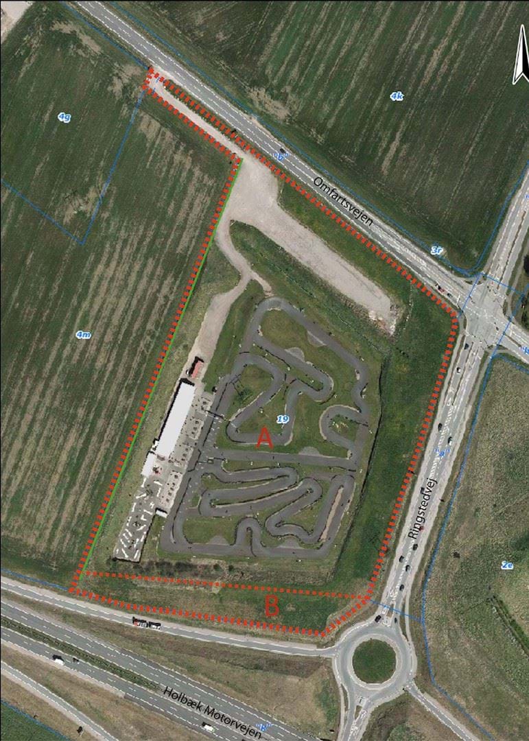 Selve gokartbanen ligger forsænket i terrænet og er omgivet af vold på alle sider af anlægget. Bygningerne ligger i niveau med gokartbanen. I den nordlige ende af området, langs Omfartsvejen og i niveau med denne, ligger parkeringsarealer til anlægget. Indkørsel sker fra Omfartsvejen. Syd for lokalplanområdet ligger tilkørselsrampen til Holbæk Motorvejen med tilhørende voldanlæg.